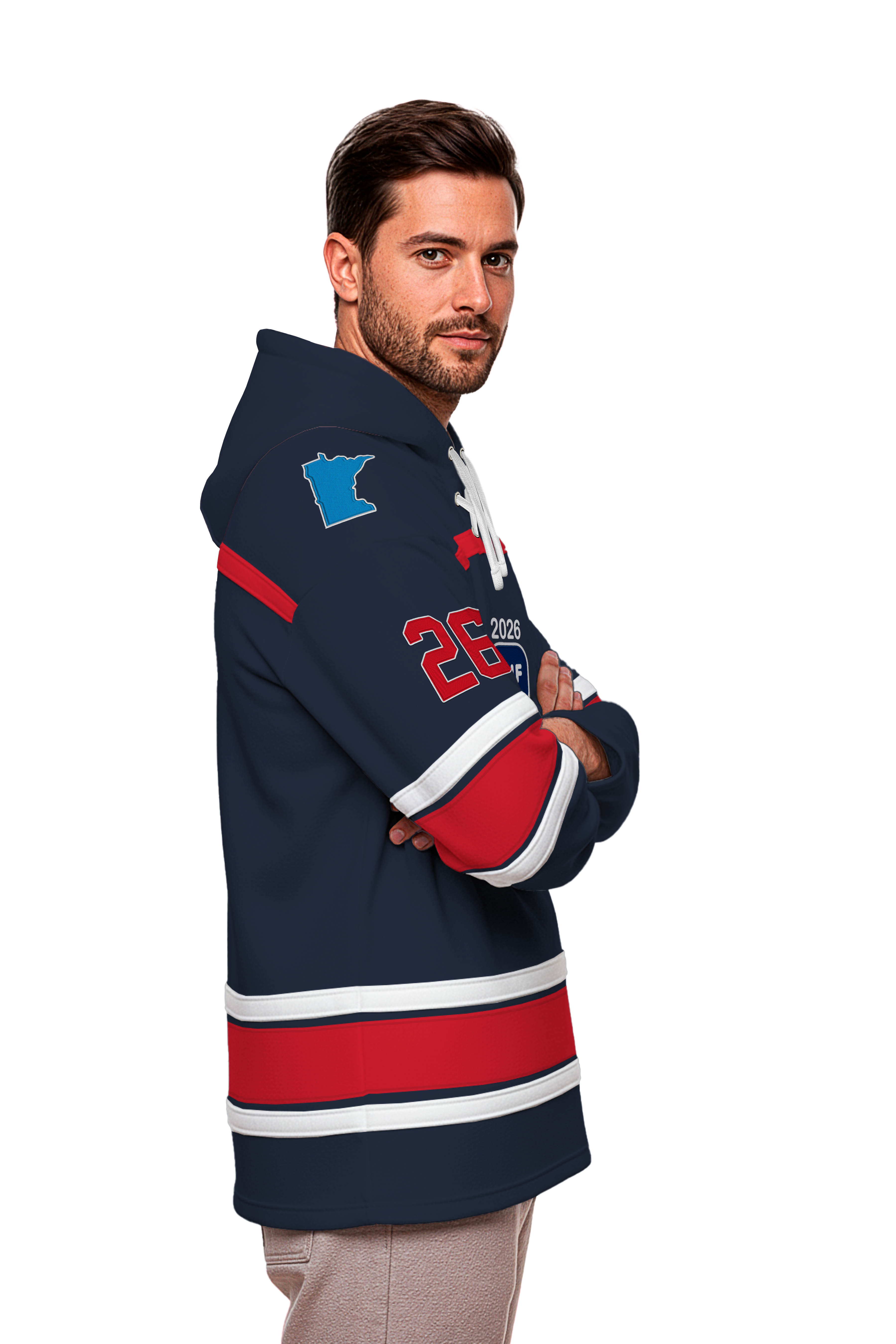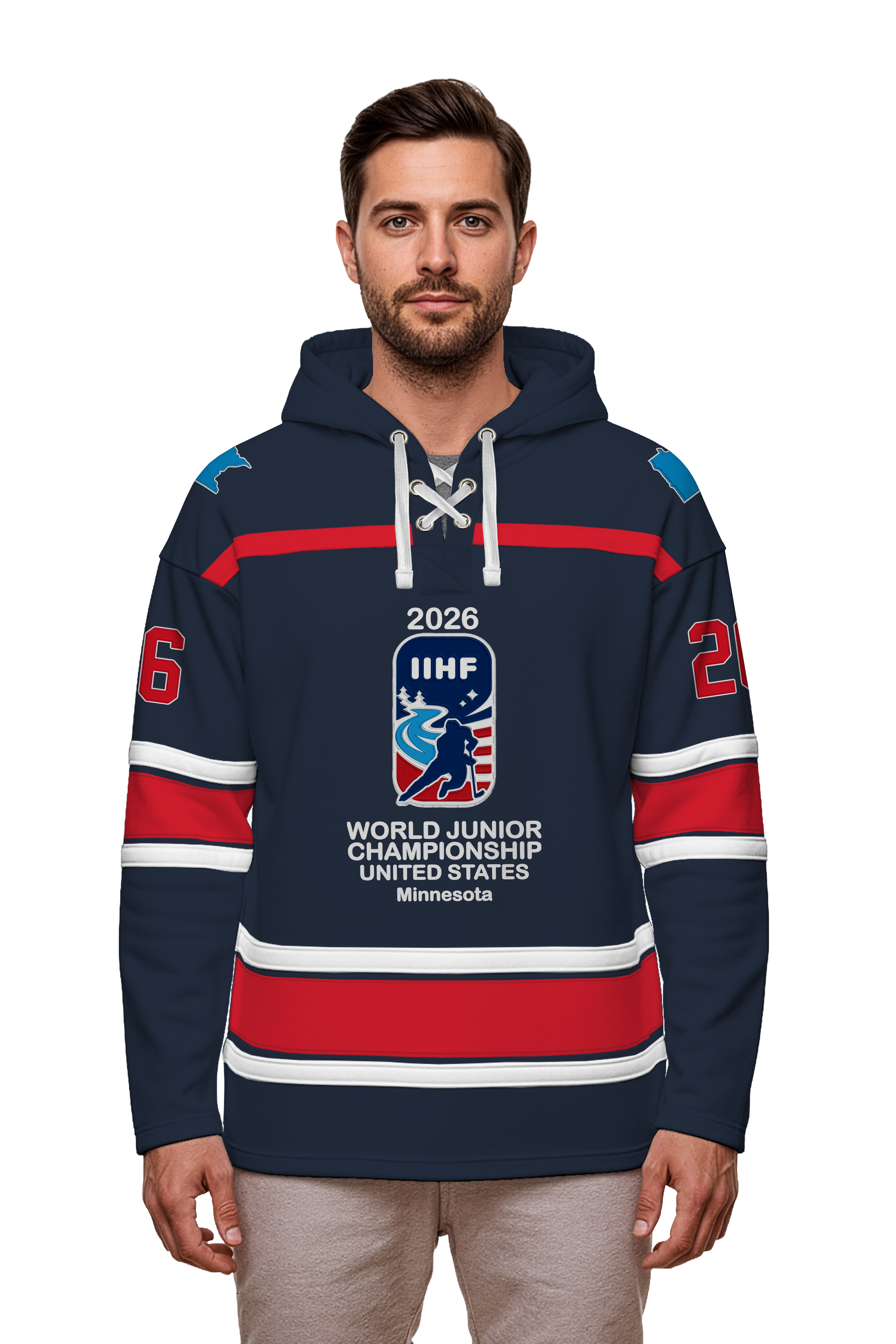 Celebrate international junior hockey excellence with this navy embroidered lace hoodie, officially inspired by the IIHF World Juniors 2026. The intricate lace detailing adds sophisticated texture, while premium embroidery showcases your passion for elite-level competition. Crafted for comfort and style, this hoodie transitions seamlessly from game day to everyday wear. Perfect for dedicated hockey fans and supporters of the world's premier junior tournament.
