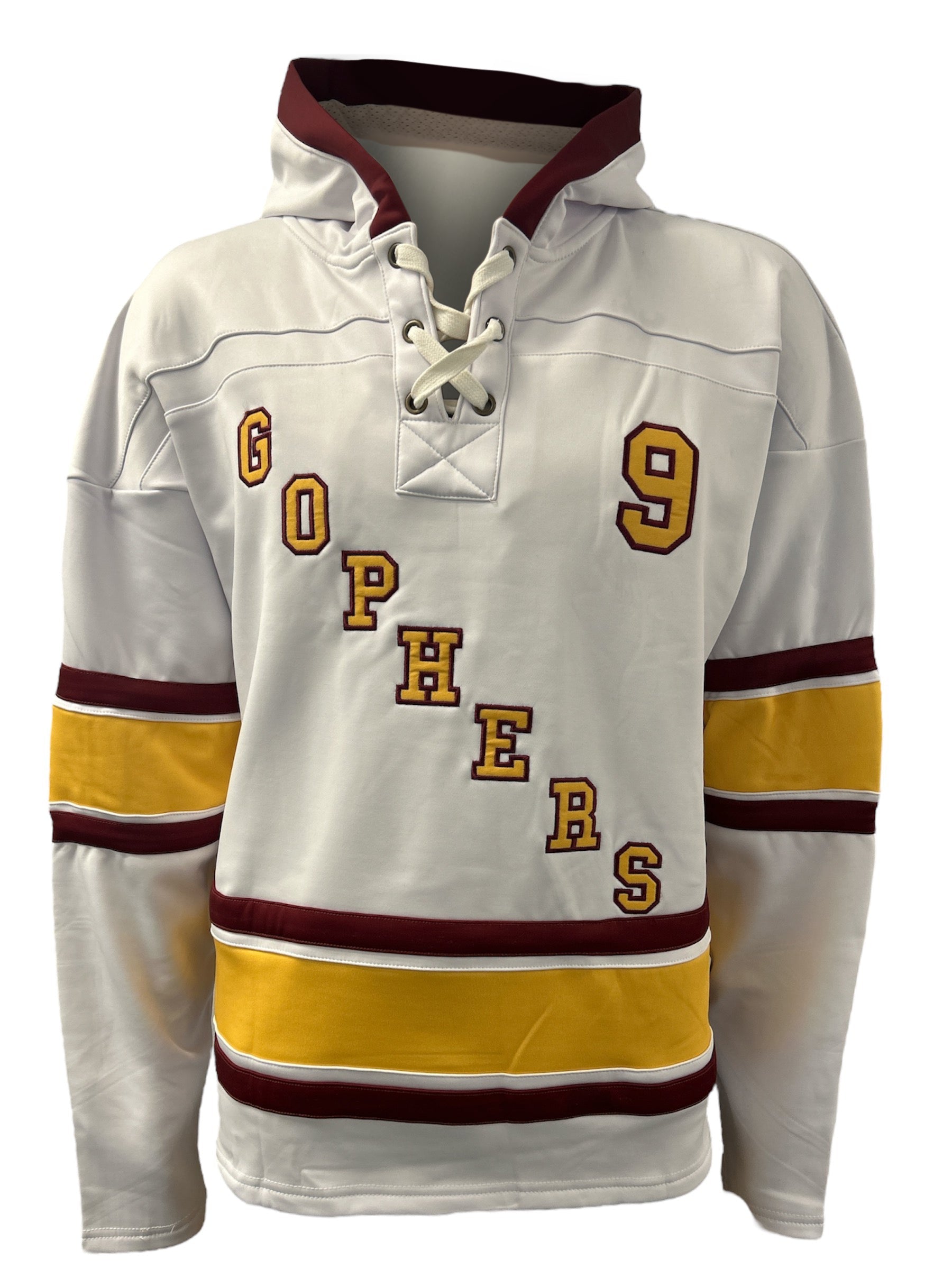 This Officially Licensed Minnesota Golden Gophers Lace-Up Pullover Hoodie is the perfect way to show your support for the Minnesota Golden Gophers. With sewn-on sleeve stripes, embroidered Logos , and performance fleece lining, this hoodie will keep you warm and comfortable all season long. The front pouch pocket is perfect for storing your essentials, and the lace-up neckline with six metal grommets adds a touch of style. Whether you're cheering on the Golden Gophers at the game or just relaxing at home, this hoodie is sure to become a favorite. Co Licensed by the Herb Brooks Foundation. Celebrating 45 th anniversary of the 1979 NCAA Championship!