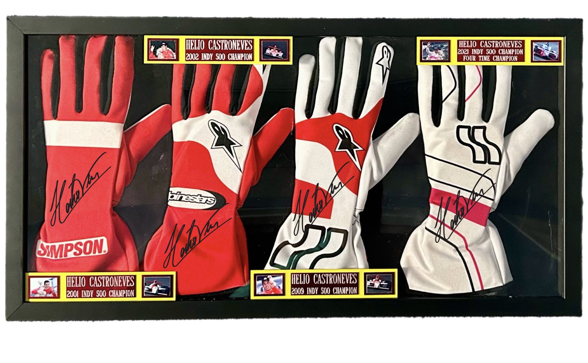 Own a piece of racing history with these authenticated framed racing gloves signed by Helio Castroneves, commemorating his legendary four Indianapolis 500 victories. This exclusive collectible celebrates Castroneves' induction into the Indy 500 Hall of Fame on May 22, 2025, making it a must-have for serious motorsport enthusiasts and memorabilia collectors.