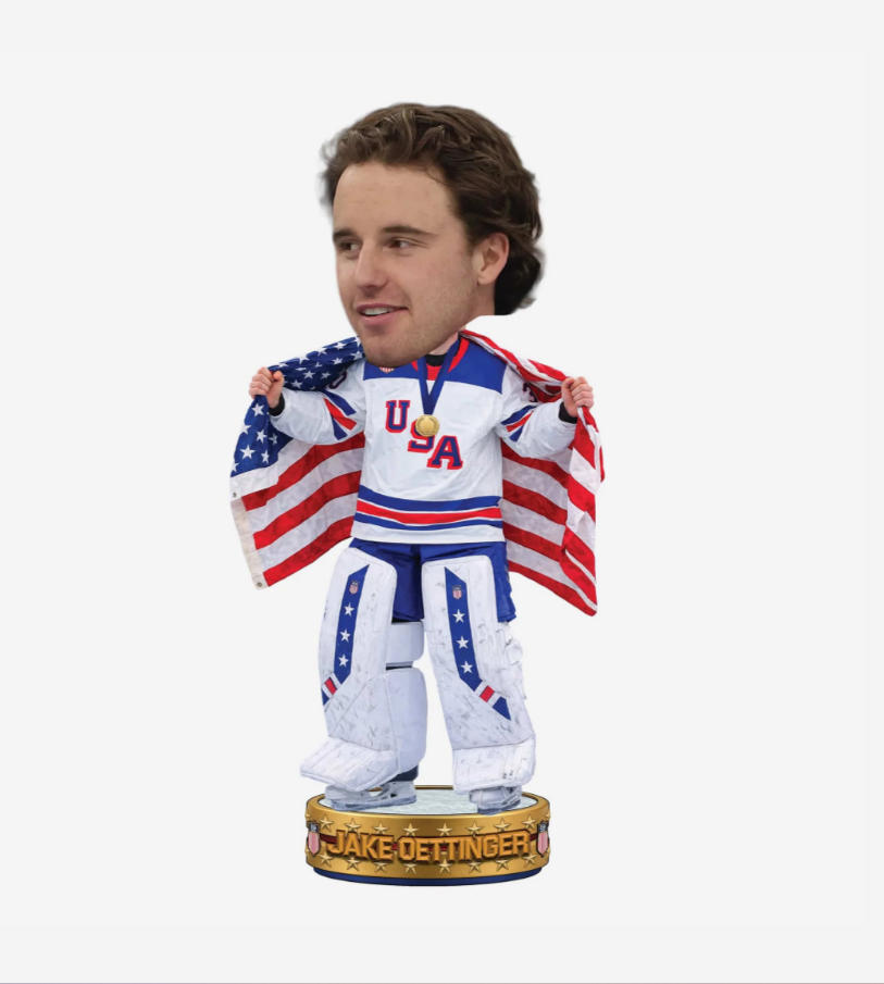 Portrays Jake Oettinger wearing his gameday uniform with an American flag draped around his shoulders in a celebratory pose