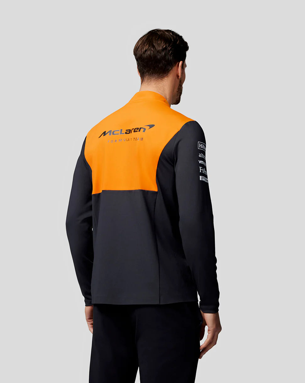 Become part of the action on the race track with this Men's McLaren Formula 1 Official Teamwear Quarter Zip Top. The quarter zip allows you to regulate your temperature, while a subtly striking Papaya colourway tape showcases your team identity. Team sponsors and logos adorn the front, sleeves, and back.