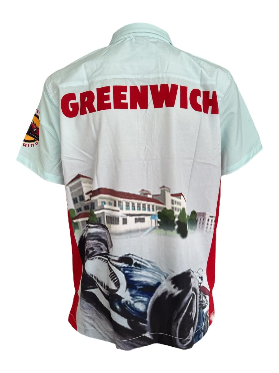 Celebrate classic motorsport heritage with the Greenwich Collection Camp Shirt. This lightweight, short-sleeve button-up features a bold front graphic inspired by vintage Grand Prix racing posters, with a sleek race car speeding past an elegant estate and the word “GREENWICH” emblazoned across the chest in striking red. Made from breathable fabric with a relaxed camp collar, this shirt blends retro flair with modern comfort—perfect for summer events, car shows, or making a standout style statement wherever you go.