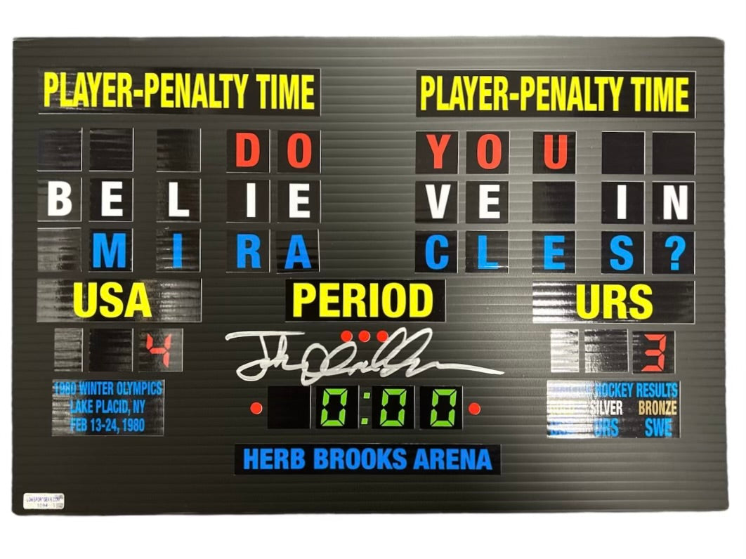 Own a piece of sports history with this Jack O'Callahan 1980 Miracle On Ice scoreboard signed by the man himself. Celebrate the legendary final score with this 12"X18" collectible. Perfect for any avid hockey fan or collector. Limited quantities available. Get yours now!
