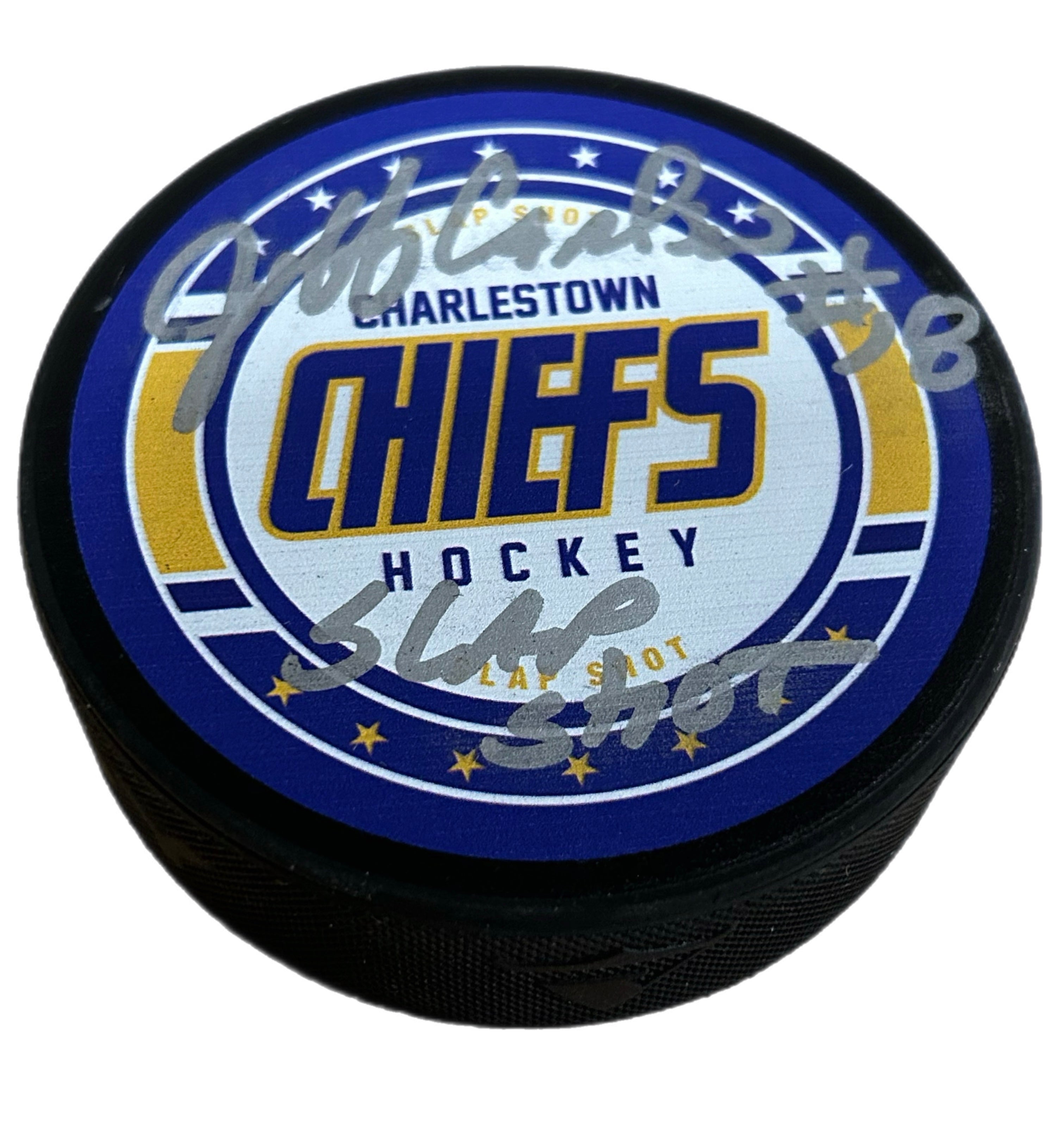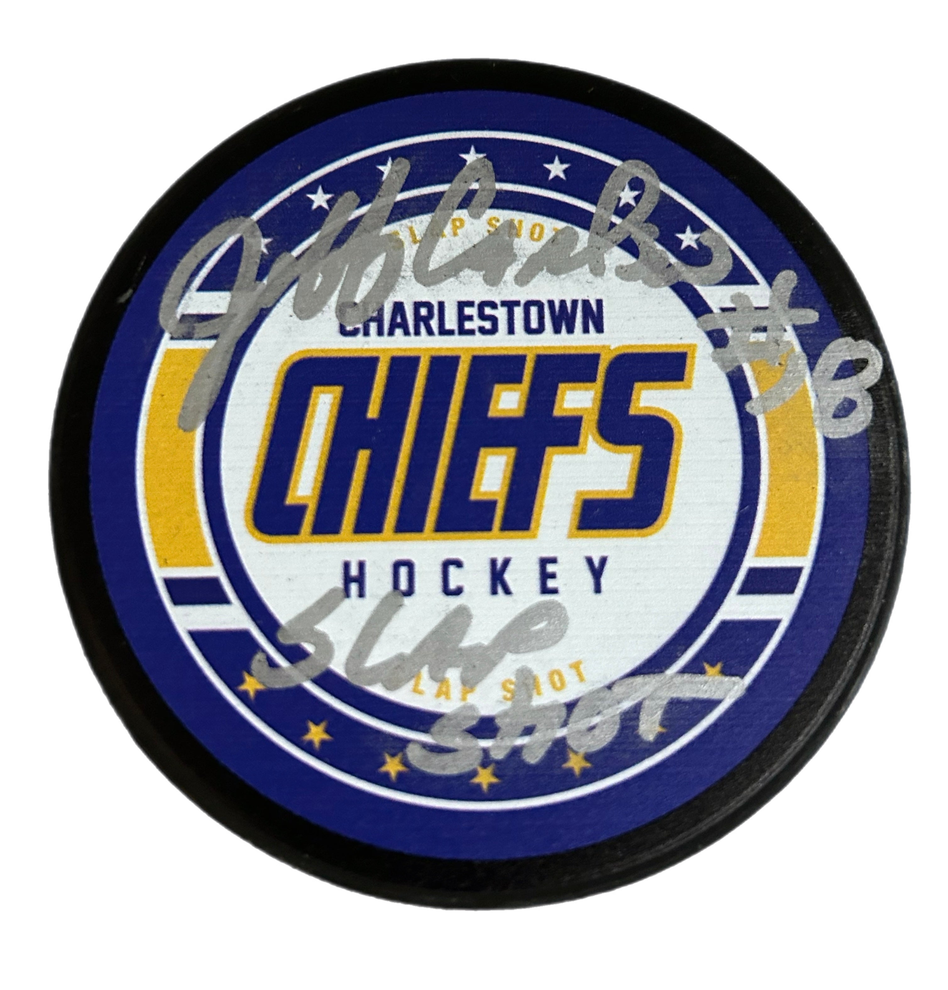 Slap Shot Charlestown Chiefs Hockey Puck Signed by Jeff Carlson #18