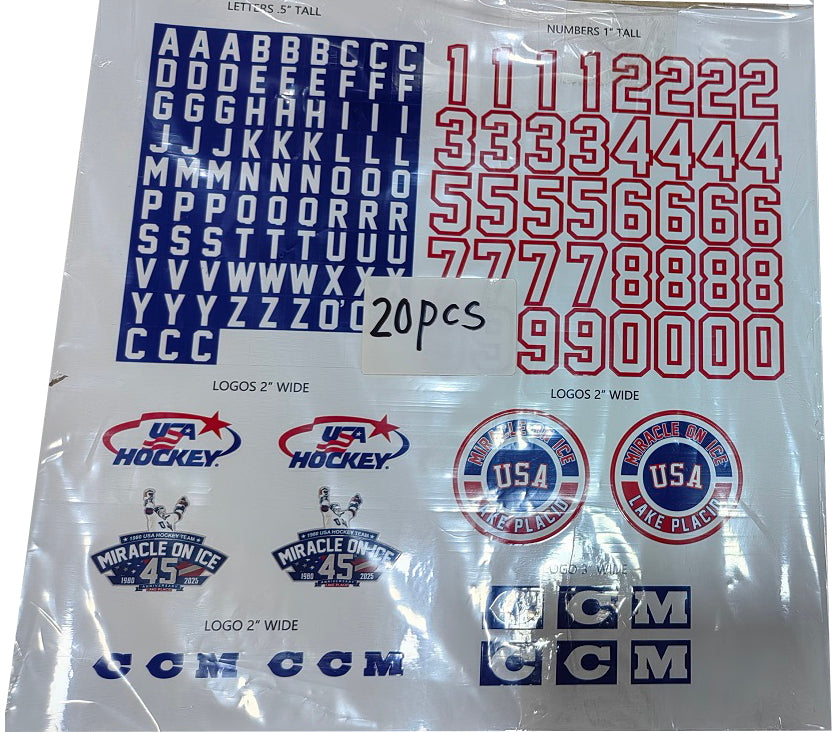 Includes Sticker Set with Multiple Copies of Numbers and Letters. USA Hockey logo and 45th Anniversary logo for the base. (Not intended for ice hockey use)