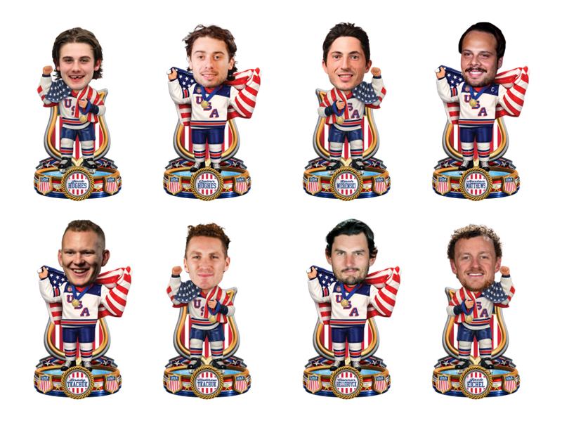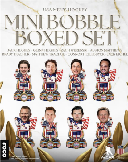 Stars, stripes, and superstar talent! Celebrate Team USA pride with this USA Men's Hockey American Flag Mini Bobblehead Boxed Set. Featuring Jack Hughes, Zach Werenski, Connor Hellebuyck, Quinn Hughes, Brady Tkachuk, Matthew Tkachuk, Jack Eichel, and Auston Matthews, this all-star lineup showcases eight of USA Hockey’s brightest stars standing proudly with the American flag. With patriotic designs and incredible player likenesses, this collectible set is the ultimate way for hockey fans to honor the red, white, and blue.